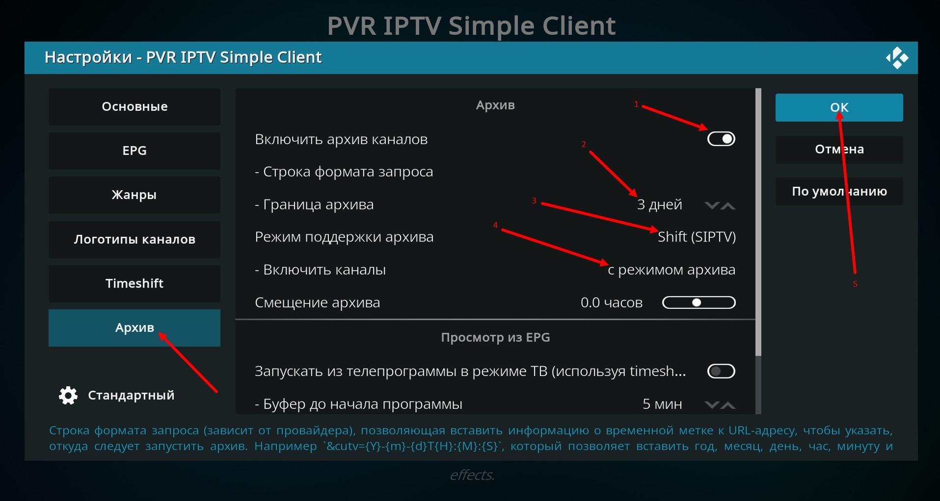 Wir gehen zu den Archiv-Einstellungen (wenn Sie in Ihren Einstellungen den Menüpunkt "Archiv" nicht sehen, versuchen Sie, in diesem Menü nach unten zu scrollen, vielleicht ist dieser Punkt einfach außerhalb des Fensters versteckt). Hier aktivieren wir die Archivnutzung (1), setzen die Archivgrenze (2) gemäß den Angaben im EPG (bei mir sind es 3 Tage), wählen den Archivunterstützungsmodus Shift (SIPTV) (3), wählen, um Kanäle mit Archivmodus zu aktivieren (4) und drücken auf OK (5).