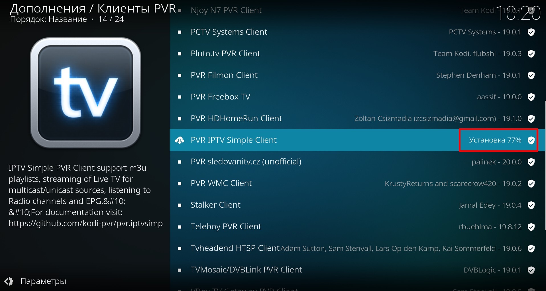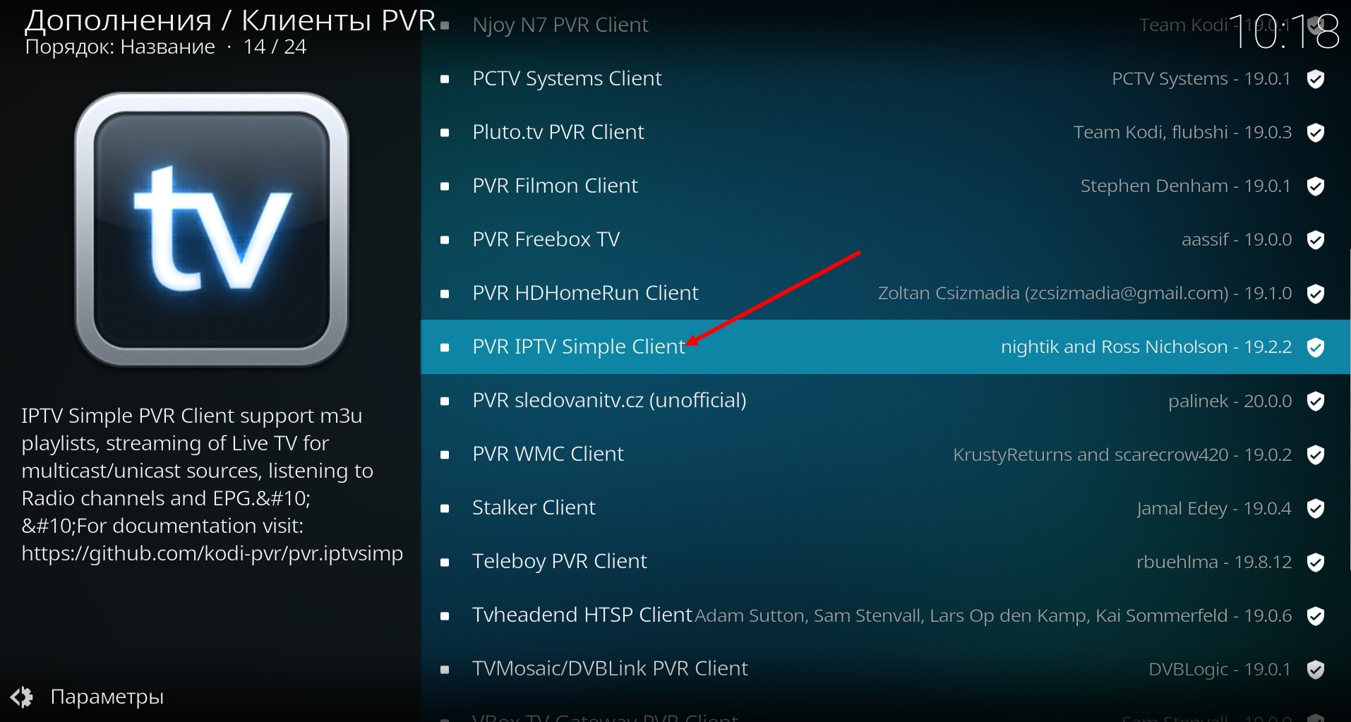 und in der geöffneten Liste finden Sie den PVR IPTV Simple Client (oder in neueren Versionen wird er IPTV Simple Client genannt).