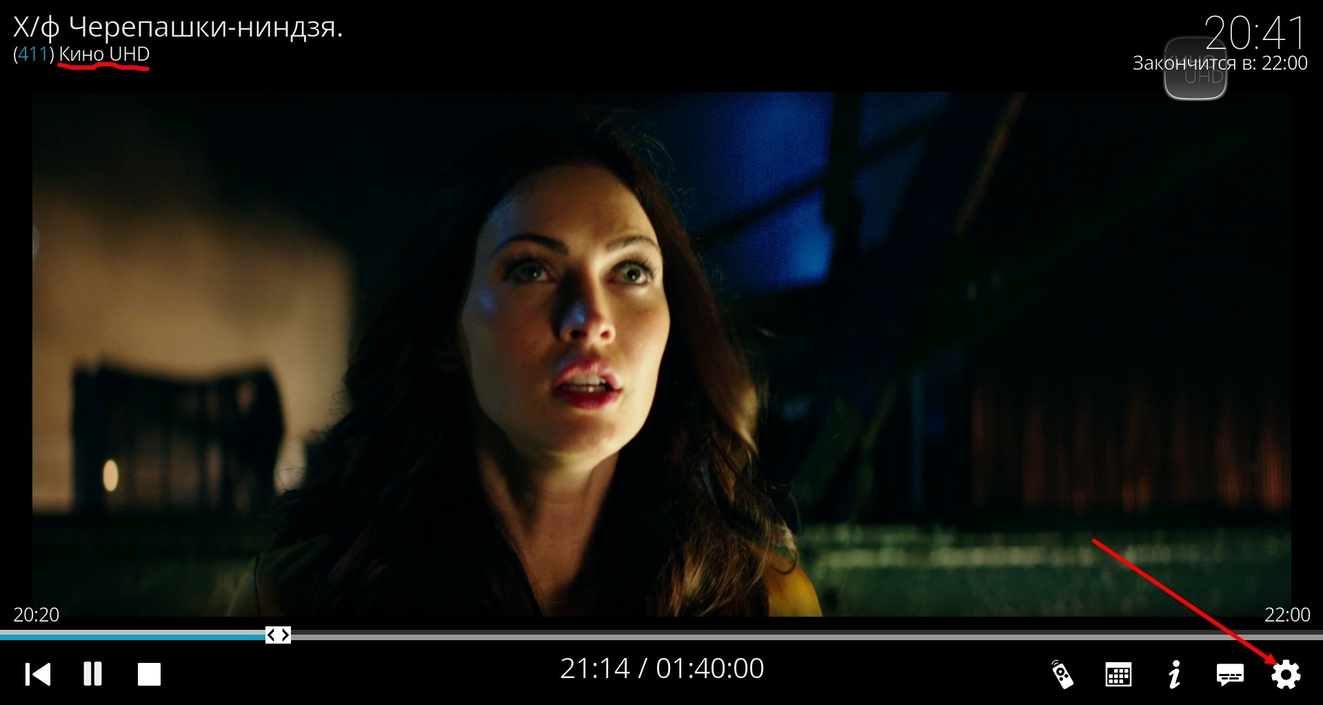 Wenn Ihr Gerät schwach ist und 4k (UHD/FHD) Kanäle hängen, können Sie versuchen, das Problem durch Einstellungen zu beheben. Schalten Sie einen 4k-Kanal ein, drücken Sie Enter oder klicken mit der Maustaste auf den Bildschirm der Anwendung, wählen Sie das Zahnradsymbol (Einstellungen) aus.