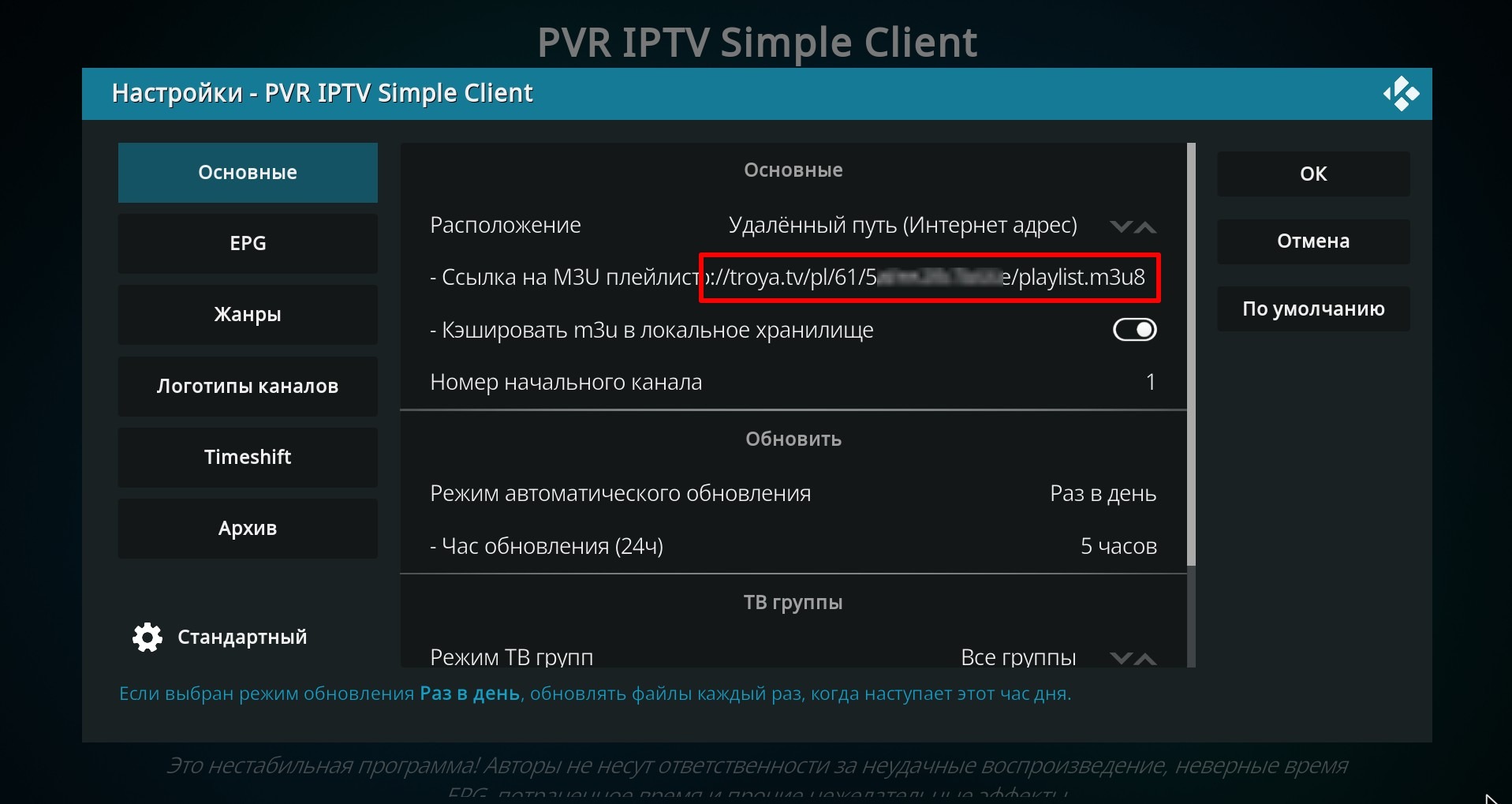 Und in das sich öffnende Fenster geben wir die Playlist-Adresse ein. Drücken Sie OK zum Speichern.