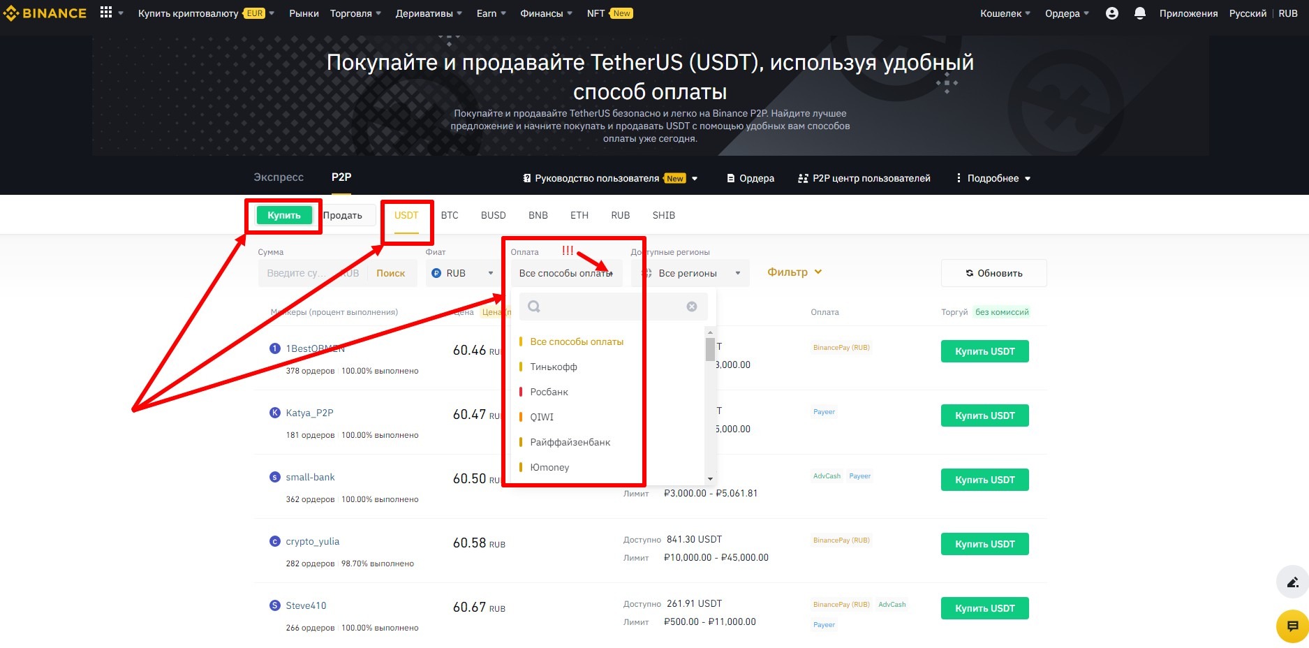 A window opens, in which choose Buy (set by default), currency USDT (set by default) and payment method in the filter line.