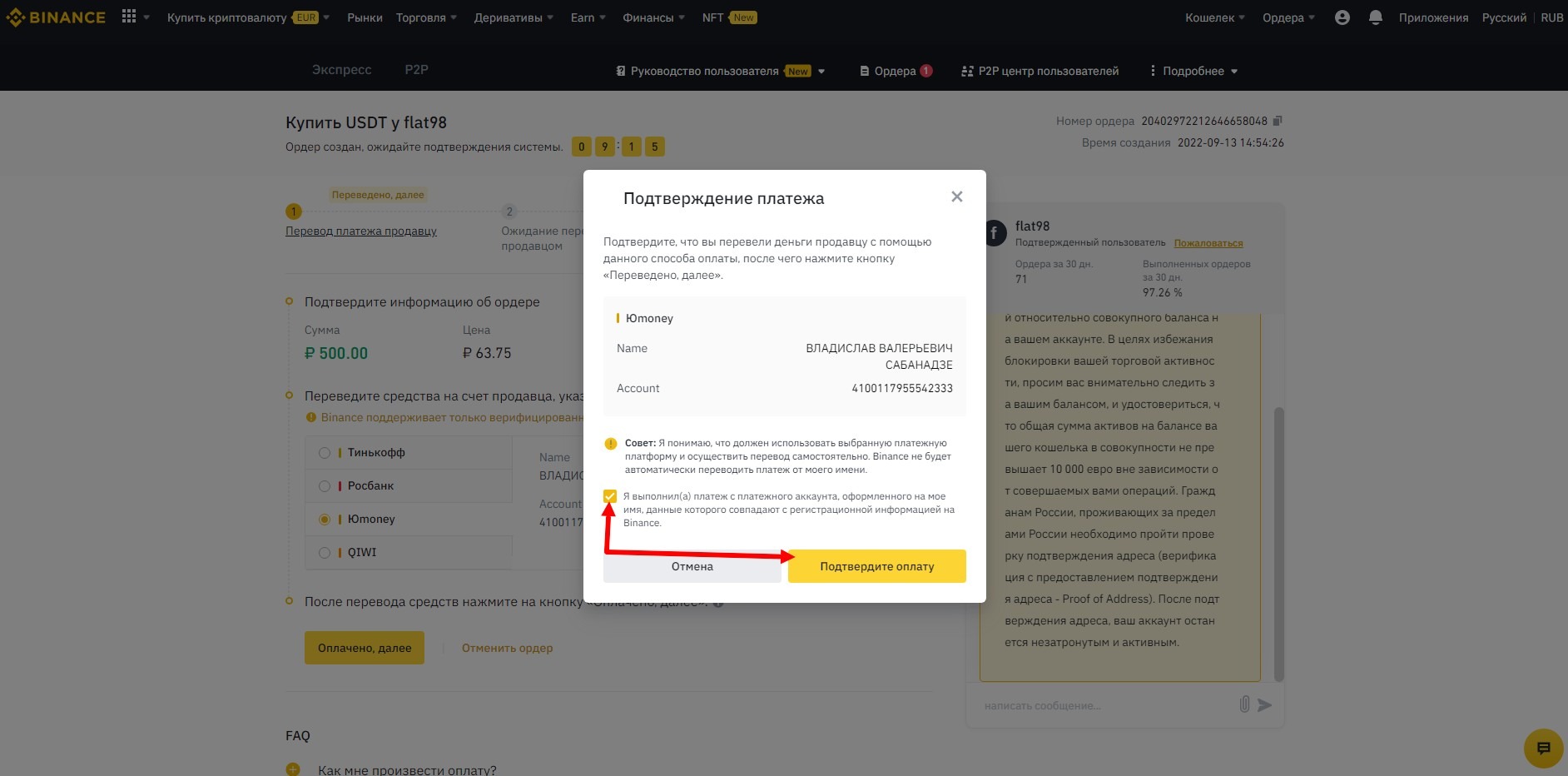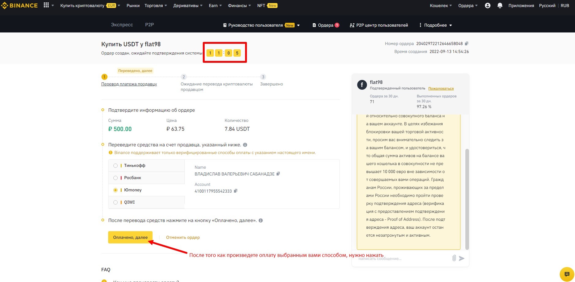 Waited a bit and clicked the button Paid, next. Note that the time for all operations is limited to 15 minutes, so once you start buying currency, don't go for a smoke or get distracted by a call, if you are late for a deal, you may get your Binance account blocked. Possibly not the first time.