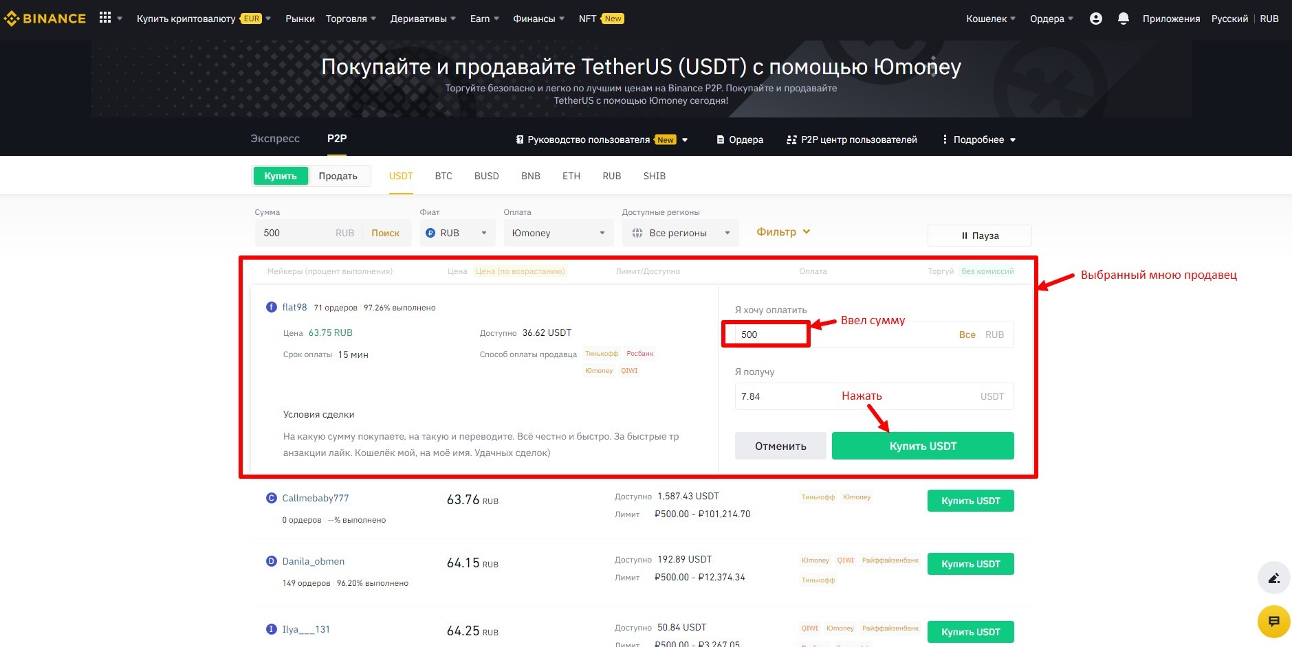в котором вводите сумму (на примере 500 руб) и еще раз нажимаете Купить USDT.