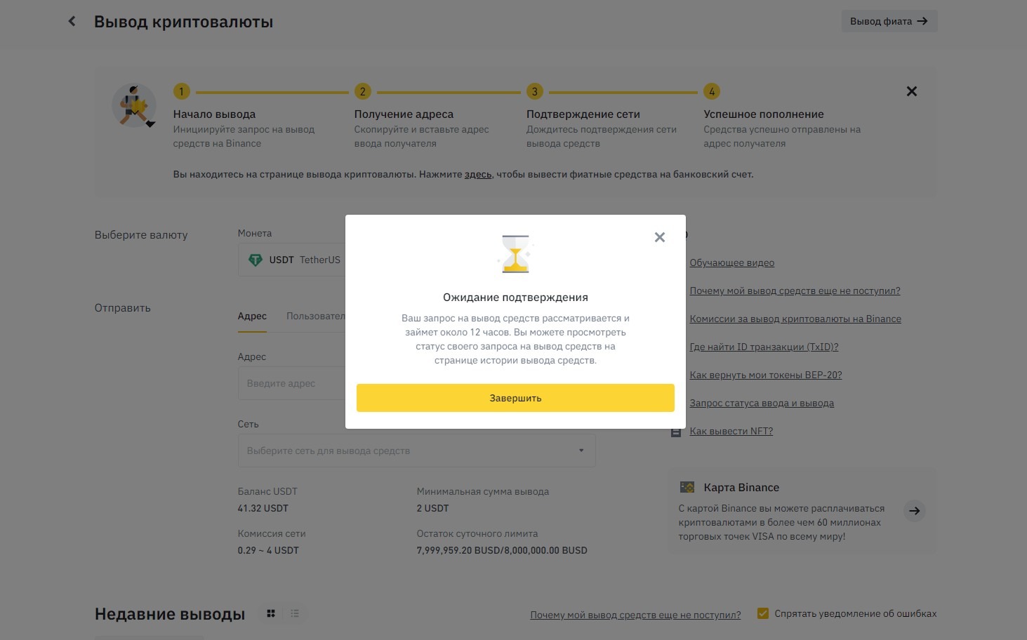 Нажимаете Завершить и нужно подождать некоторое время, пока появится платеж (вывод) в истории транзакций кошелька.