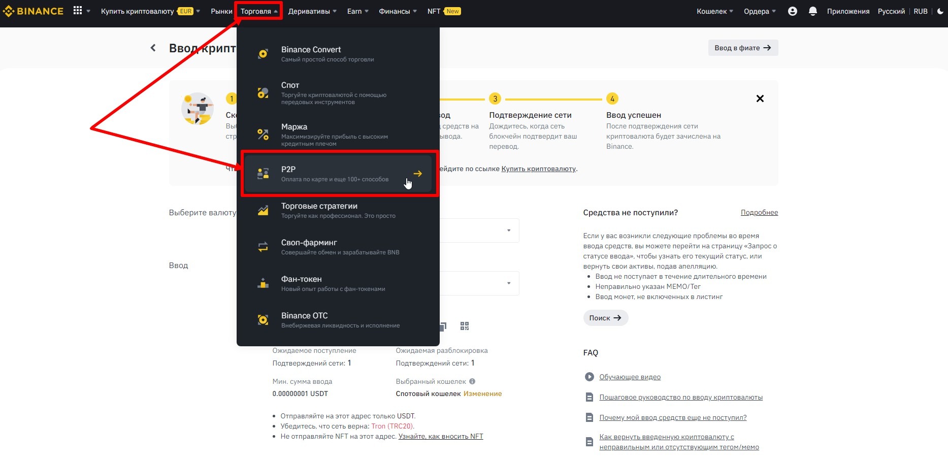 После создания кошелька проходите в раздел Торговля и выбираете P2P.