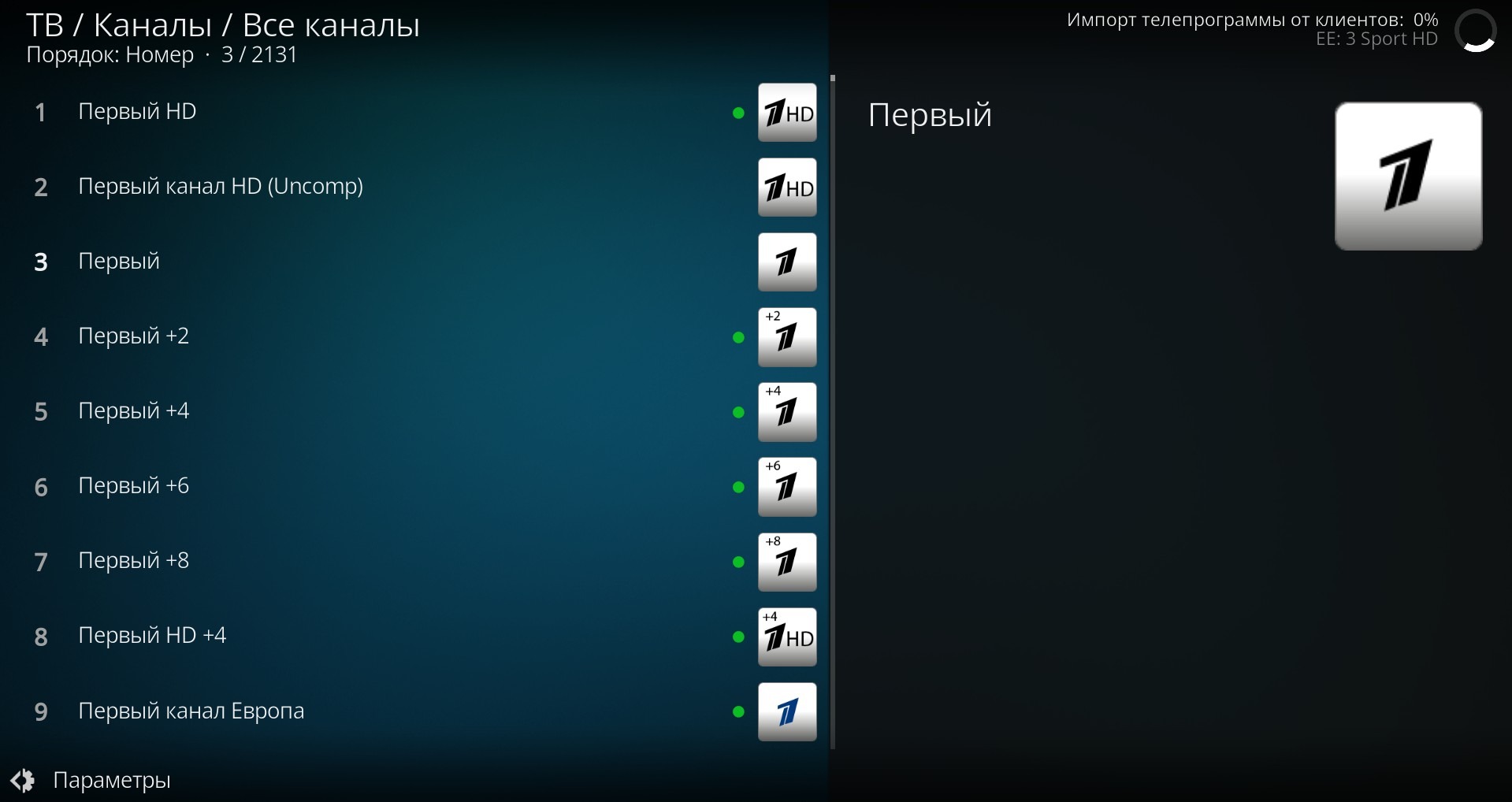 Некоторое время ждем, загружается клиент, список каналов и телепрограмма (в правом верхнем углу информация об этом).