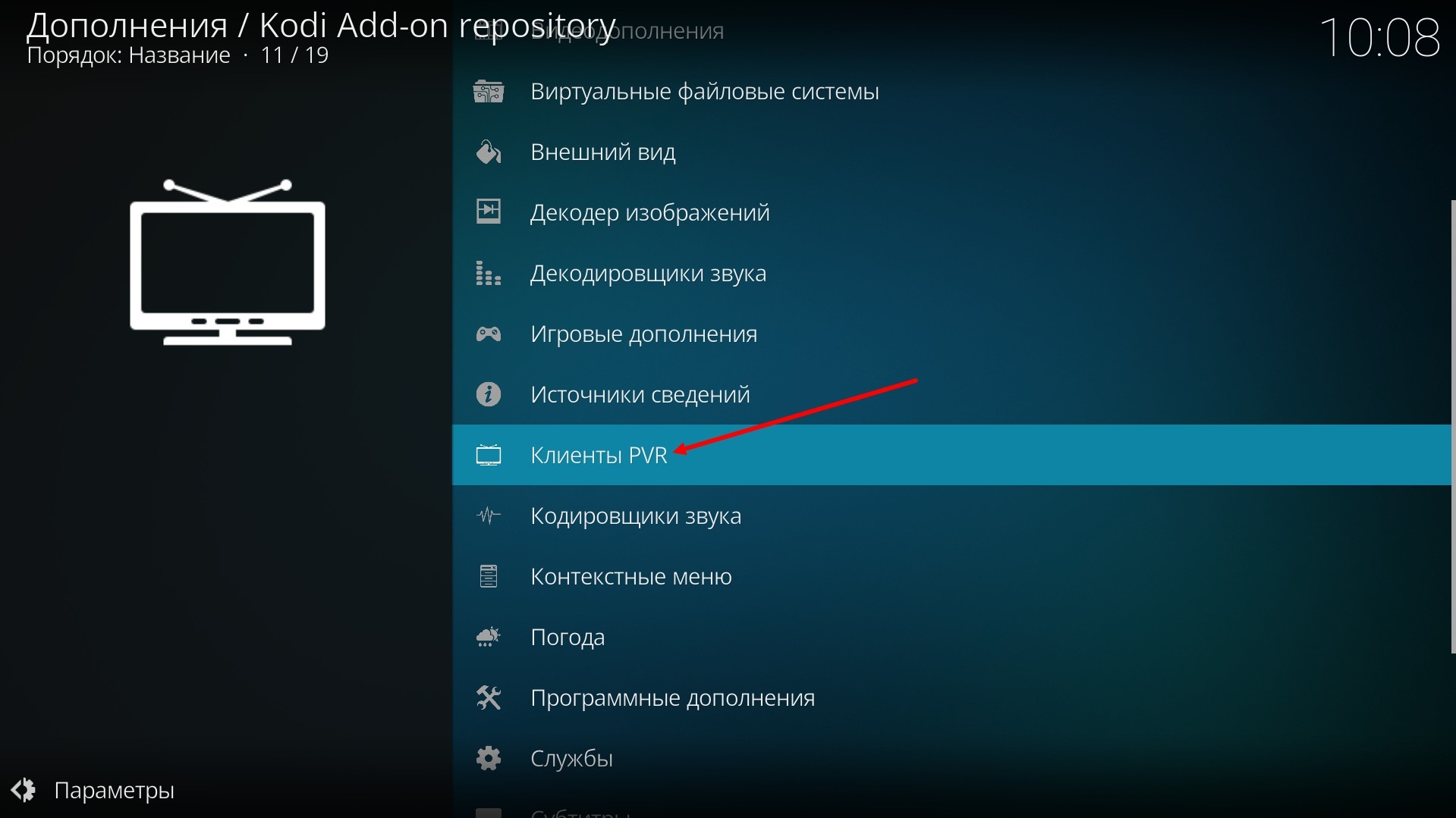 и в открывшемся списке находим PVR IPTV Simple Client (или в новых версиях он называется IPTV Simple Client).