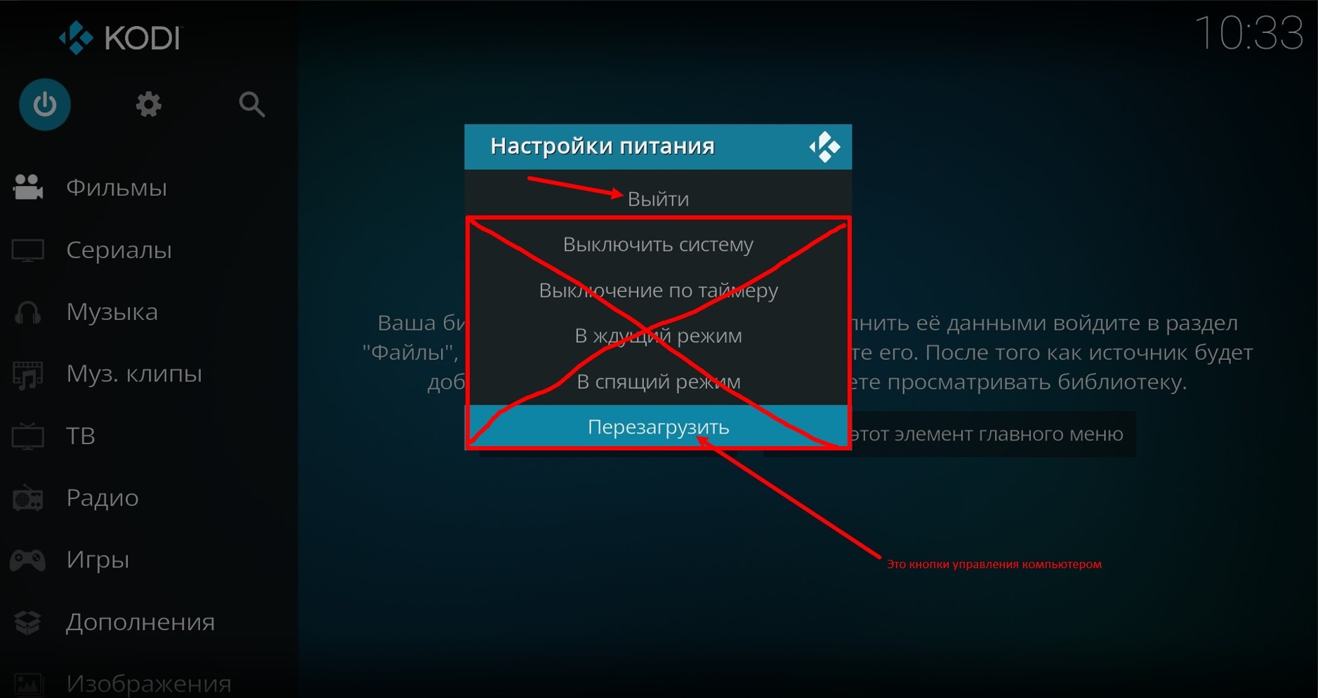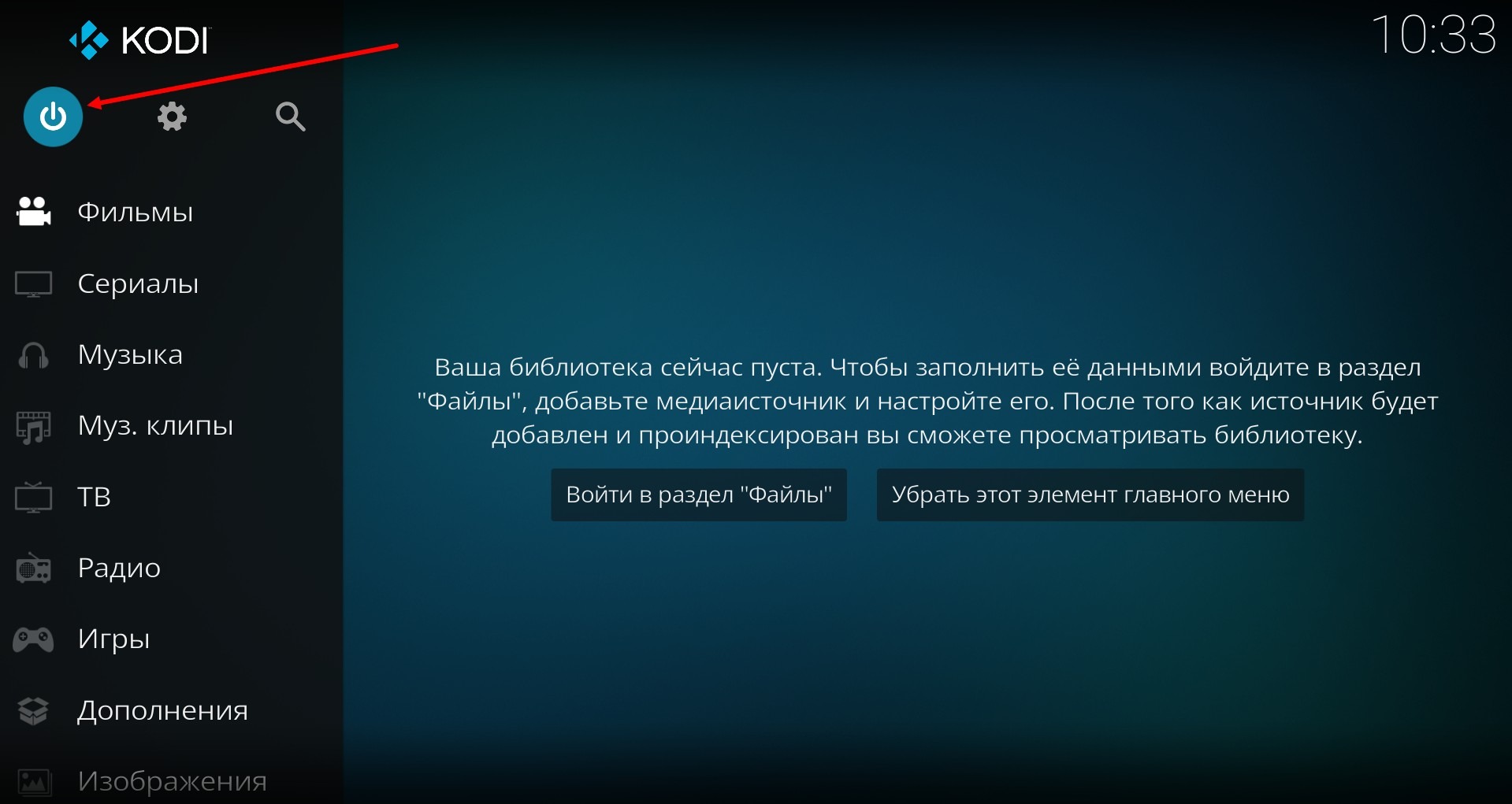 Перезагружаем Kodi, для этого выходим из приложения, нажав на значок выключения