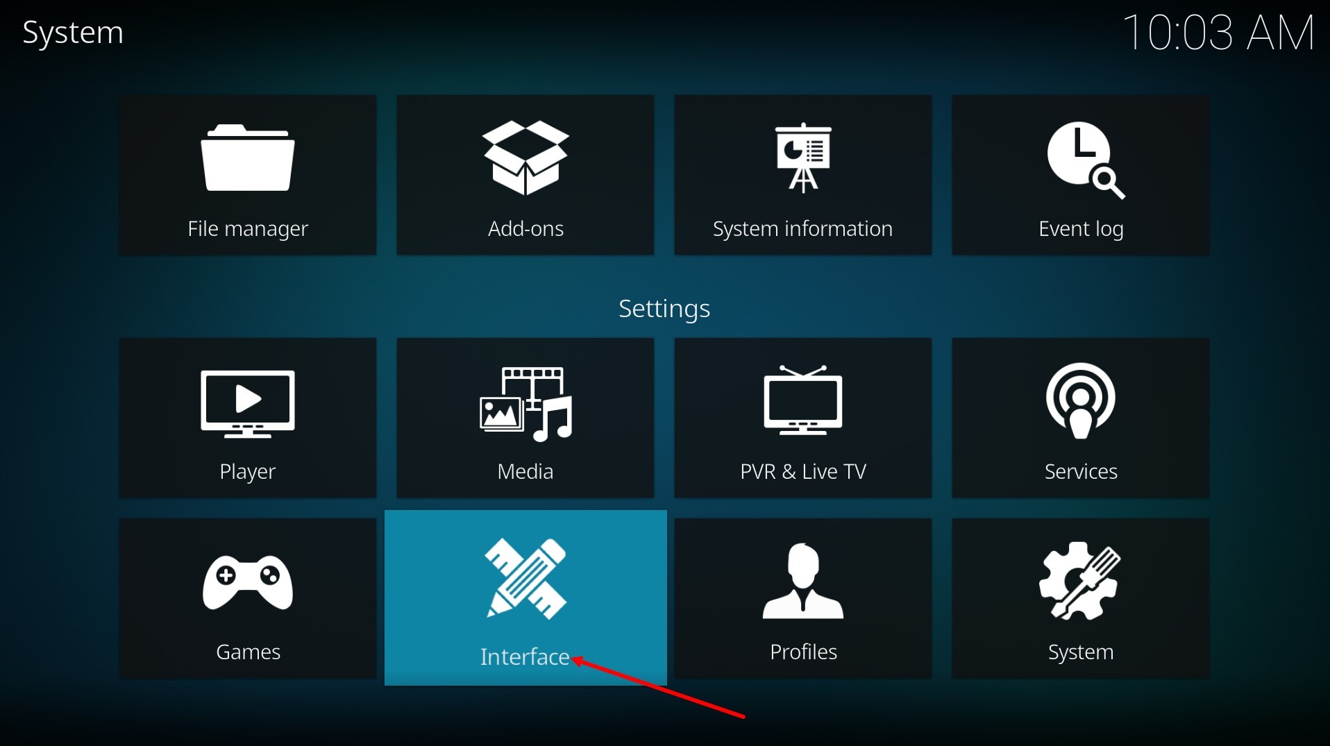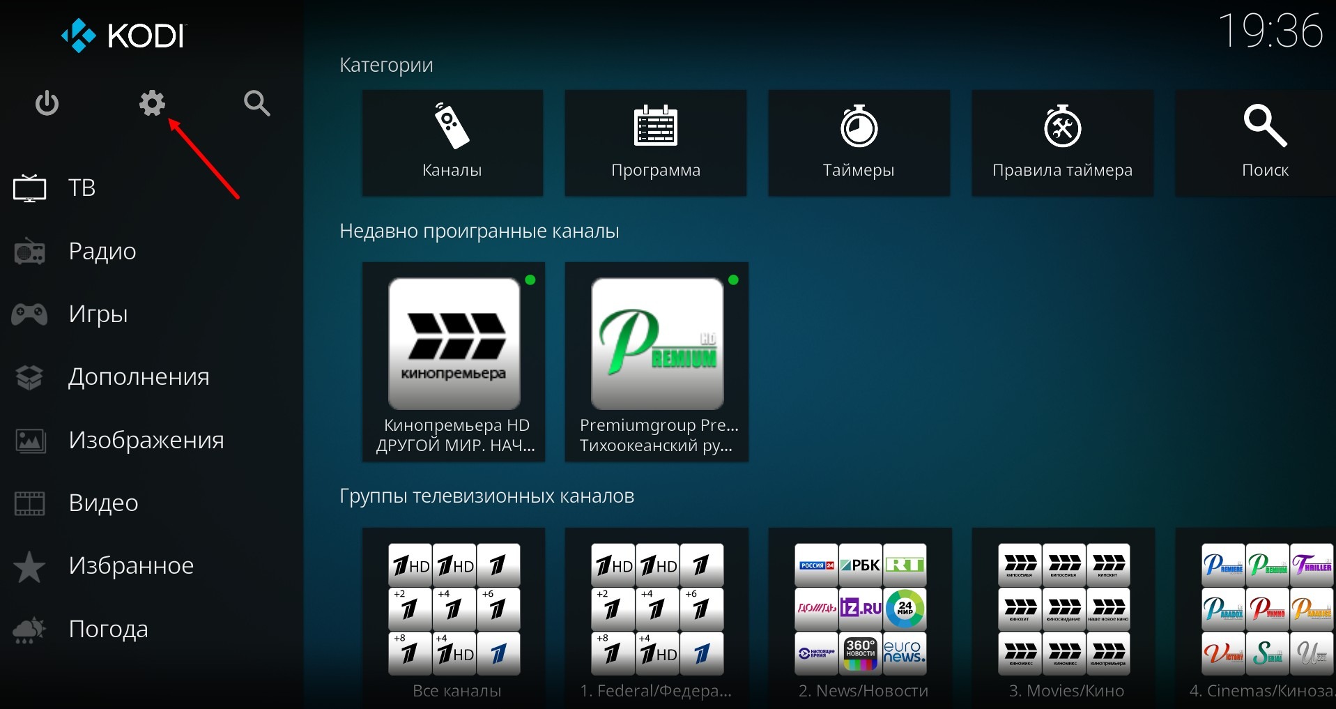 Если вам нужно вернуться к настройке клиента PVR, то несколько раз нажимаем Esc, пока не попадете в главное меню Kodi. Жмем на значок шестеренки.